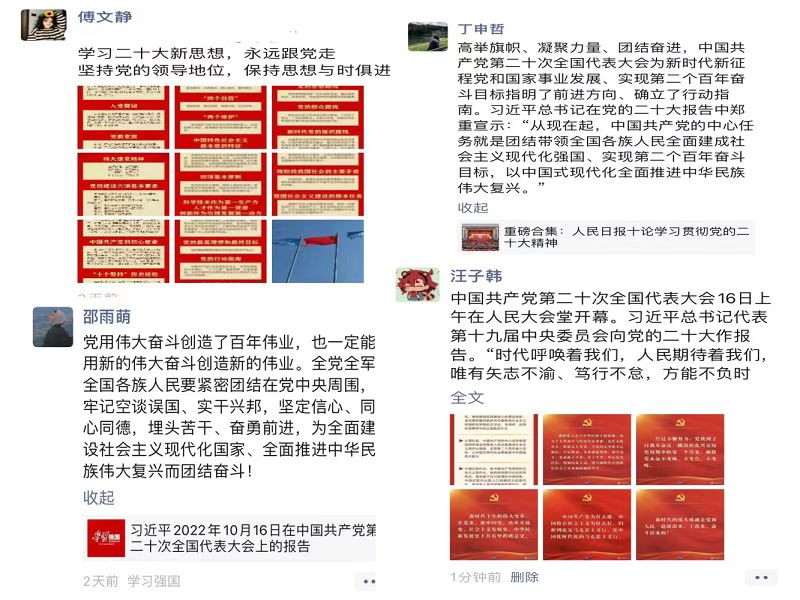 学院还依托党校和团委,集中组织观看了【二十大观察】、【十年·答卷】、《领航》等纪录片,举办了“青春献礼二十大 强国有我新征程”—“青春之声”红歌演唱微视频录制活动;举办了党的二十大精神学习体会“微分享”——用微博、微信、腾讯QQ等微媒体平台实时分享党的二十大报告内容、“中国这十年”的伟大成就、学习感悟等活动;积极筹备“学习二十大 永远跟党走 奋进新征程”微党课比赛。学院以青年学生喜闻乐见的方式,鼓励青年学生结合自身学习工作实际,围绕深入学习宣传贯彻党的二十大精神,用习近平新时代中国特色社会主义思想武装头脑,用新时代十年的伟大成就鼓舞青年学生,为第二个百年奋斗目标的实现贡献青春力量。