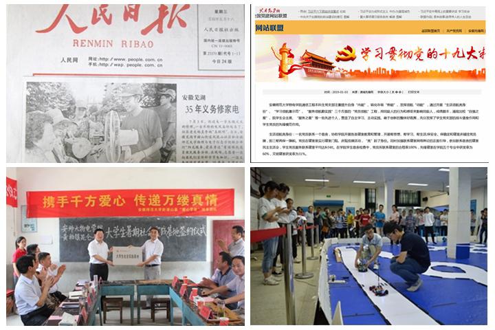 人民日报、共产党员网、新华网等主流新闻媒体先后40余次报道学院育人事迹,电子爱好者协会获得省优秀江淮志愿服务集体,安徽省省志愿服务项目大赛中获得金奖1项,大学生就业合作战略联盟获评全国职业指导优秀成果三等奖,2项事迹获“感动师大”十佳事迹,4次荣获“就业工作先进单位标兵”,4次获得暑期社会实践优秀组织奖,获得国家级科技奖励42人次。