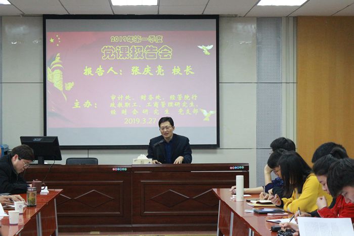 本网讯 (经管学院 张庆)327日下午,在经管学院行政楼二楼报告厅,审计处党支部、财务处党支部、经管学院工商管理研究生党支部、经财会研究生党支部和行政教职工党支部5个支部共50余名师生党员同堂聆听由校长张庆亮主讲的党课报告会。校党委常委、副校长朱家存以所在财务处党支部普通党员的身份参加党课报告会。报告会由审计处党支部书记郑继辉主持。