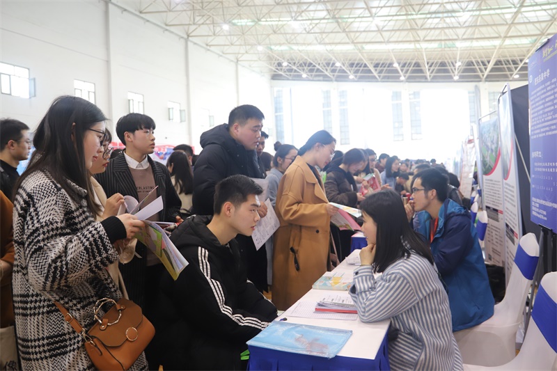 招聘会现场氛围热烈,各学校机构展位前挤满了手持简历、有备而来的毕业生。不少招聘单位的宣传海报吸引了毕业生们驻足观看,招聘摊位前毕业生积极与招聘人员进行交流咨询,而招聘人员也会就一些问题向应聘者进行提问。招聘现场人潮涌动、气氛热烈,同时也让人感受到一丝竞争和压力。