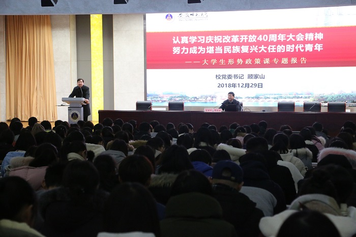 本网讯 (王俊荣/文 邾强/图)12月29日,校党委书记顾家山以《认真学习庆祝改革开放40周年大会精神,努力成为堪当民族复兴大任的时代青年》为主题在理科大楼报告厅为师生讲授形势政策课,来自思想政治教育专业的本科、研究生,校团学骨干,宣传部、教务处、学工部、校团委、马克思主义学院负责同志和部分思政理论课教师代表、辅导员约400余人聆听了本次形势政策课。