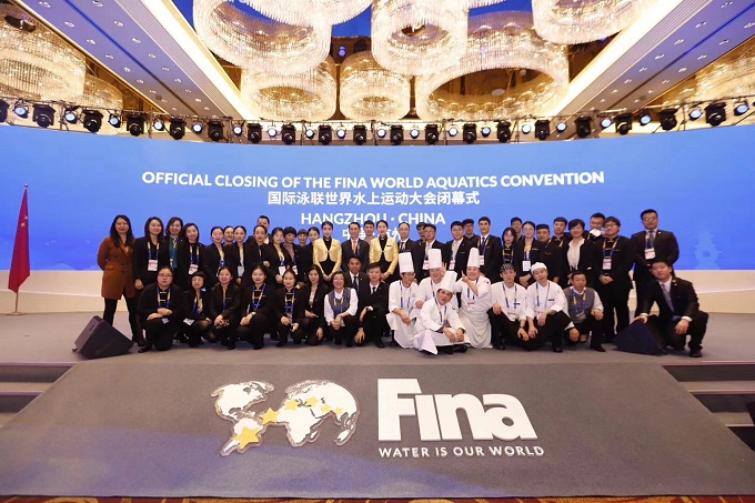 本网讯(地旅学院 陈健)2018年12月8日-10日,第5届国际泳联世界水上运动大会在中国杭州洲际酒店举行。来自国际泳联大家庭和全球170个国家(地区)近1100名水上运动界代表参加了会议。国际泳联世界水上运动大会是世界泳坛最高级别的会议,由会议和展览两部分组成。杭州洲际酒店为我校地理与旅游学院校外就业实习基地,正在该酒店开展专业顶岗实习实践的25名2016级酒店管理专业本科生圆满完成大会服务的光荣任务。