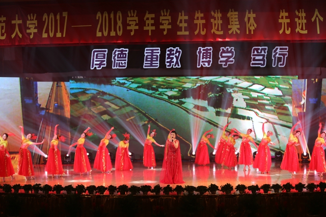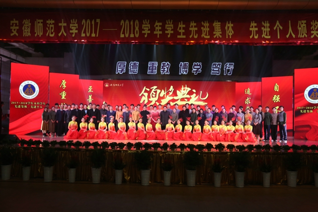 本网讯(文/王亚男 胡轶凡 图/张鑫)学海砥砺,朋辈携手,踏响时代鼓点;风华正茂,榜样引领,绘就青春华章。12月12日下午,学校在花津校区大礼堂隆重举行2017-2018学年学生先进集体、先进个人颁奖典礼。校领导顾家山、李琳琦、程度、毕明福、陆林、校首届“三全育人”最美教师(教育工作者)、各部门主要负责人、各学院领导、专业负责人、全体学生工作者和学生代表出席颁奖典礼。