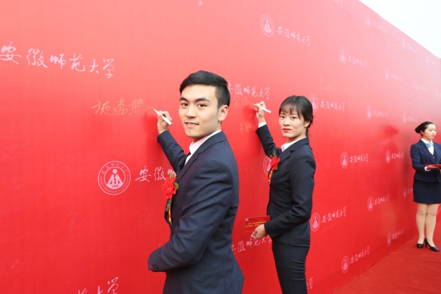 颁奖典礼以红毯走秀、心语投递、视频展示、多彩表演等生动活泼的方式,凸显以生为本、立德树人的办学理念,充分发挥学生优秀典型的示范、引领、激励作用。在寓意“信念坚定、志在千里、脚踏实地”吉祥物“安安”“诗诗”和易班熊“师小易”的引领下,受表彰学生代表迈着从容自信的步伐,在同学们的欢呼和掌声中携手走过“筑梦大道”,来到签名墙前签名、投放“青春心语”并与校领导合影留念,在场同学无不感受着榜样的力量。