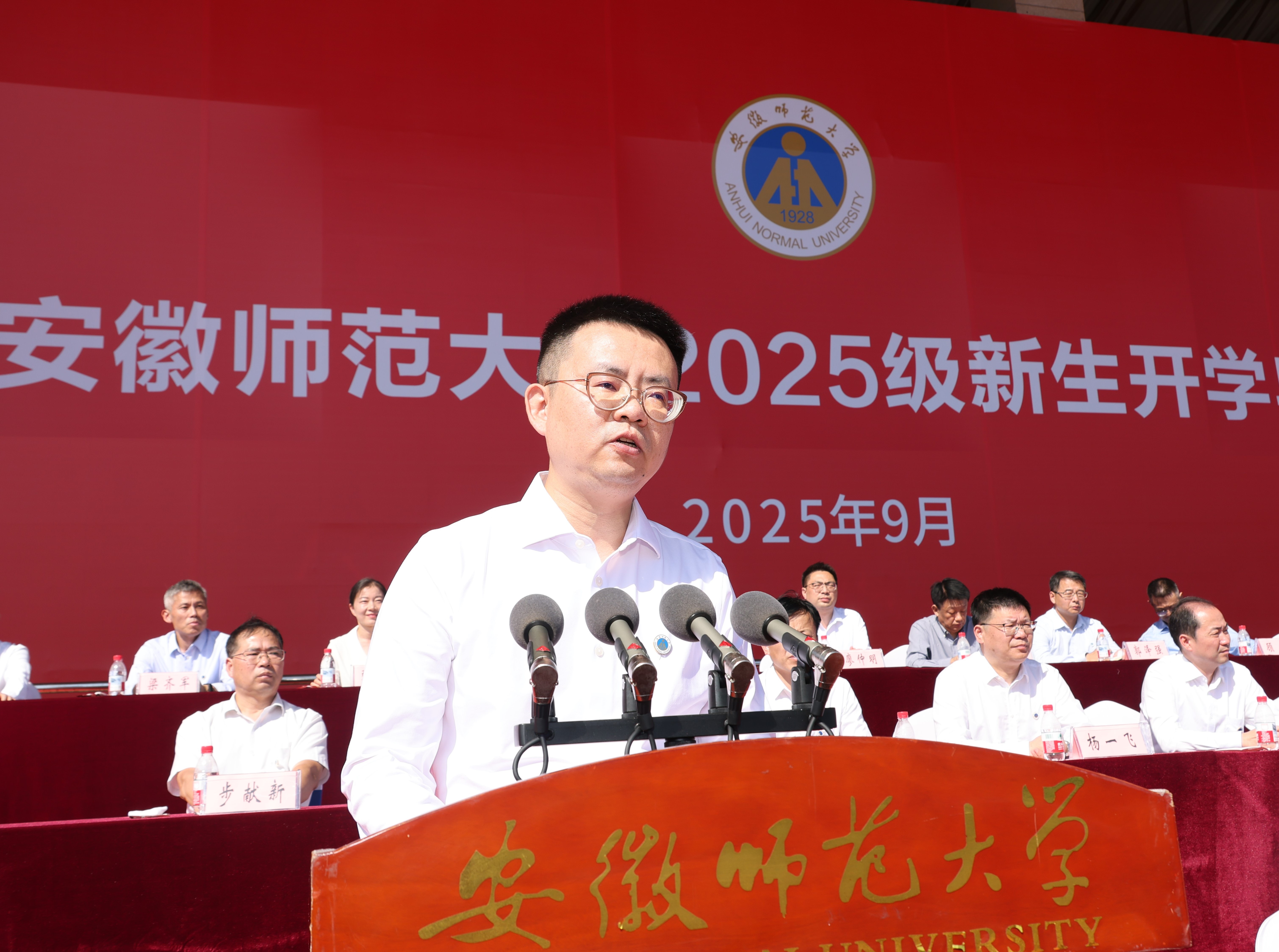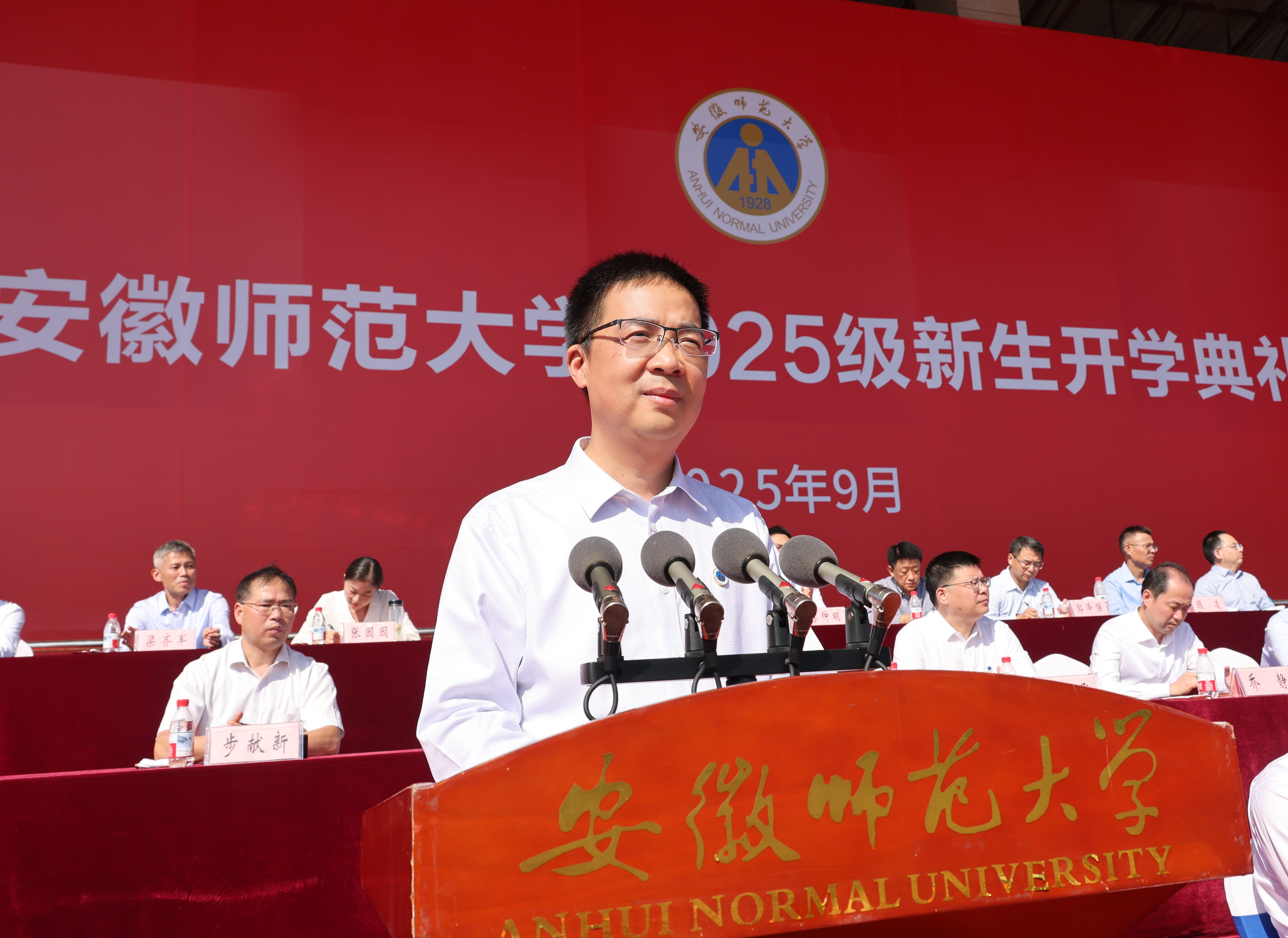 金秋时节,丹桂飘香。9月22日上午,安徽师范大学花津校区北侧田径场旌旗招展、青春涌动,学校2025级新生开学典礼在此隆重举行。1万2千余名新生意气风发、怀揣梦想,齐聚在这所近百年历史的学府,正式开启“师大人”砥砺奋进、追求卓越的崭新征程。校领导蒋家平、熊宇杰、曾黎明、高峰、胡靖、茆磊、桑青松、王刚出席典礼。国家杰出青年科学基金获得者、中国科学技术大学数学科学学院副院长、教授、博士生导师、我校1997届数学系校友王毅教授,我校生命科学学院教授、博士生导师、国家杰出青年科学基金获得者李枢强应邀出席并分别作为校友代表和教师代表发言。学校有关职能部门主要负责人,各学院主要负责人、分管负责人、教师代表、在校生代表、全体2025级新生和辅导员参加典礼。典礼由校党委书记蒋家平主持。