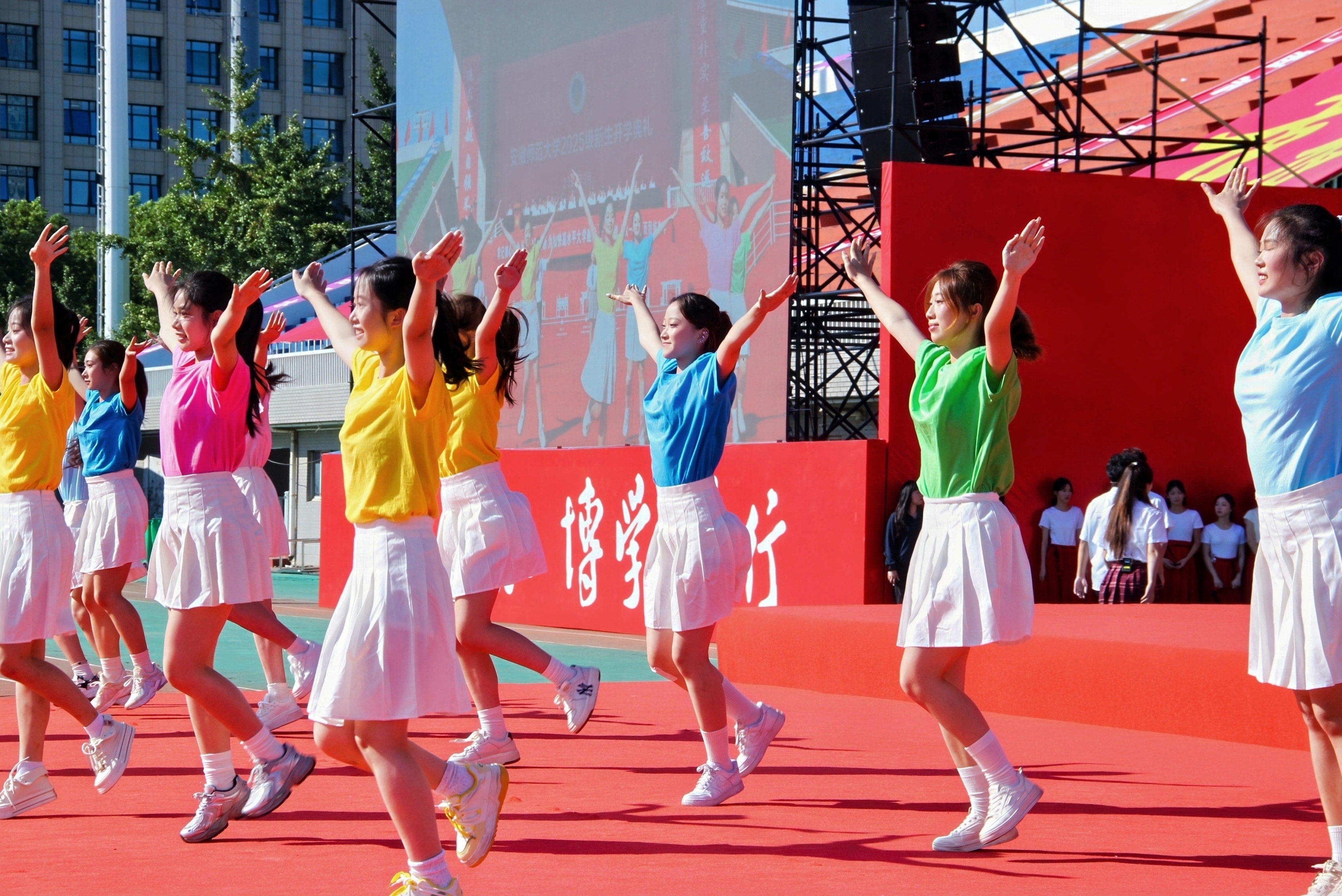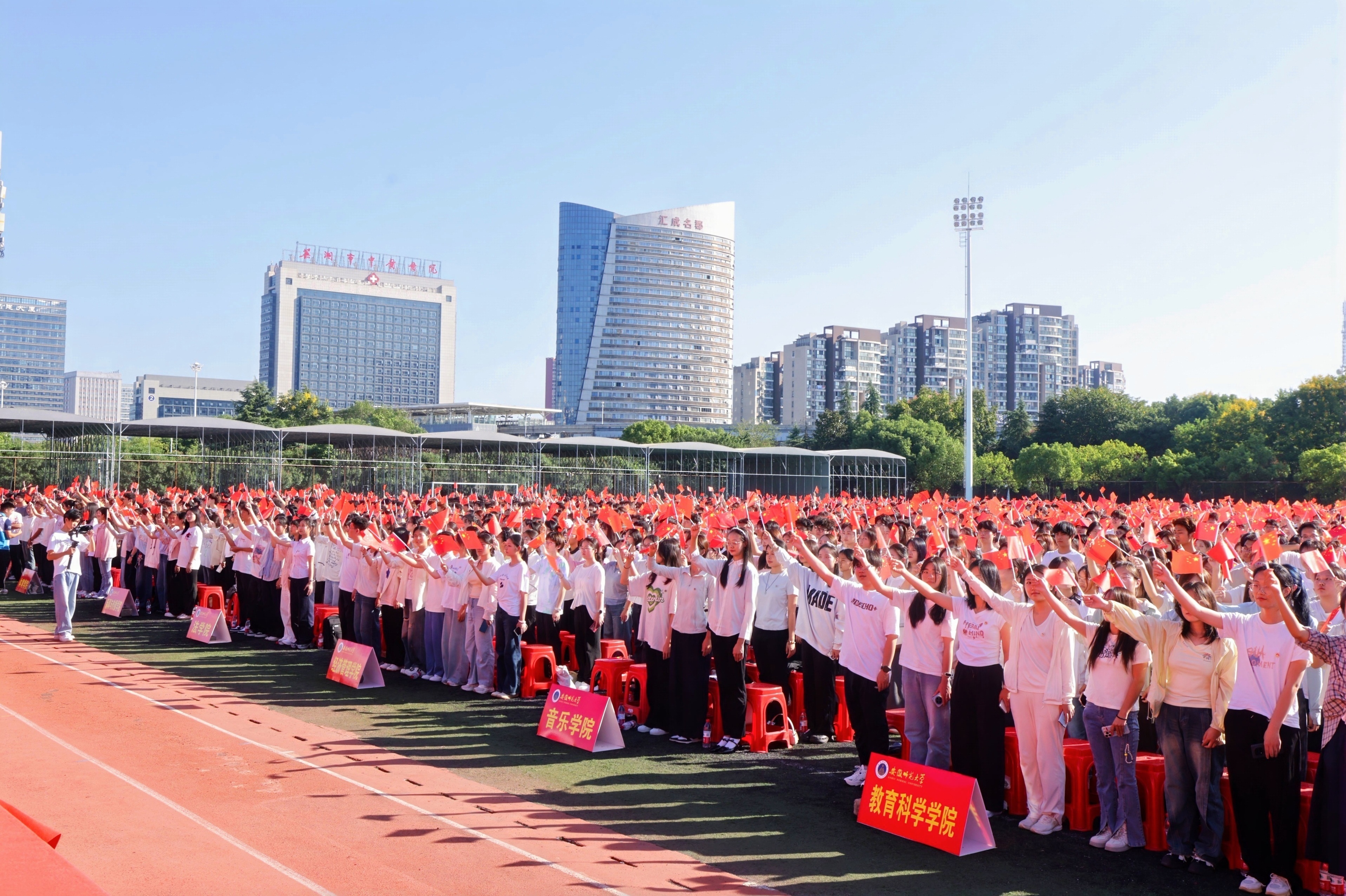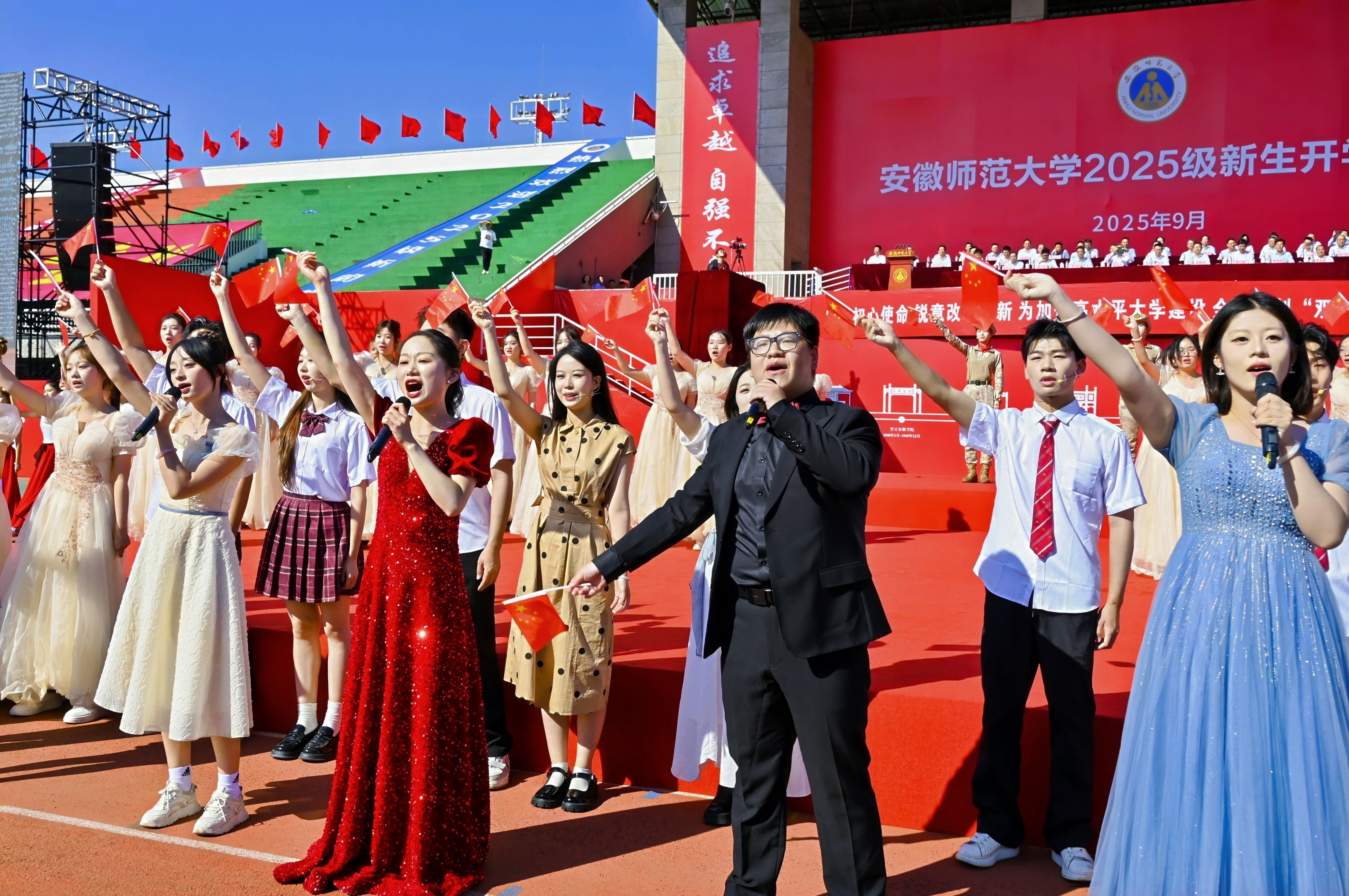上午9时,开学典礼在庄严的国歌和嘹亮的校歌声中正式拉开帷幕。全体师生肃立,面向国旗,高唱国歌,注视着五星红旗冉冉升起。礼毕,校旗缓缓升起,全场齐唱校歌,铿锵旋律回荡在田径场上空,凝聚起师大人共同的身份认同。