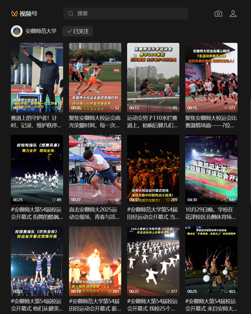 大记团50余名学生记者,围绕运动会开幕式、运动会日常策划制作系列全媒体图文、视频作品,累计推出原创视频20条、图文推文3篇,全平台浏览量超350万次。微博话题“安徽师范大学第54届田径运动会”登上同城微博热搜榜,阅读量达10万,有效扩大了校运会品牌影响力。