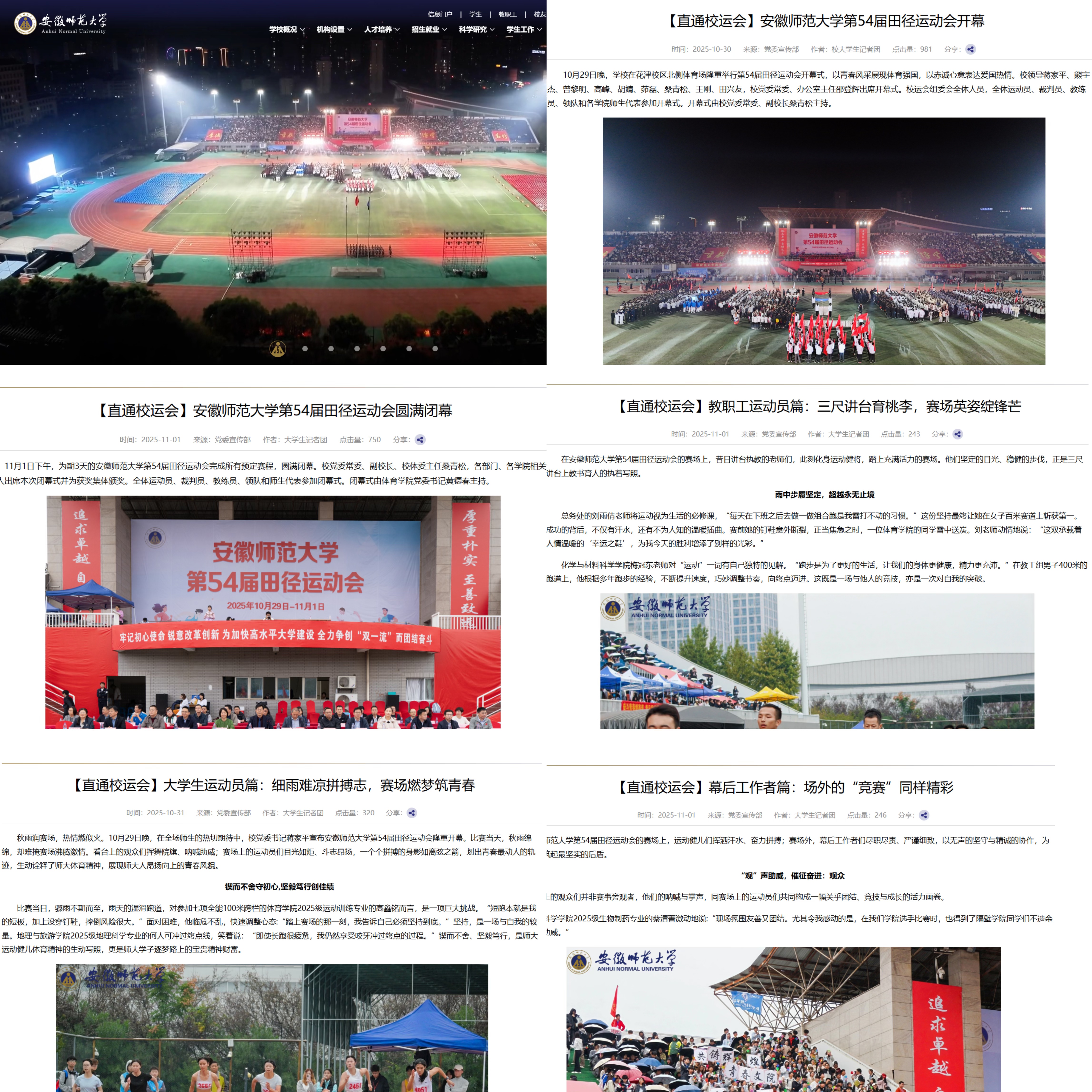 校内宣传平台持续深耕,在校园网主页策划设立【直通校运会】专题专栏,组织大学生记者团学生记者深入赛场一线,聚焦开闭幕式盛况、师生运动员的拼搏瞬间、裁判员及后勤保障人员等幕后工作者,累计采写发布5篇新闻报道,生动展现了师生们拼搏向上、团结奋进的体育精神。宣传团队同步强化可视化表达,设计制作校园网首页Banner动图,以动态集锦形式呈现开幕式及赛事高光时刻,立体展示校运会精彩瞬间。