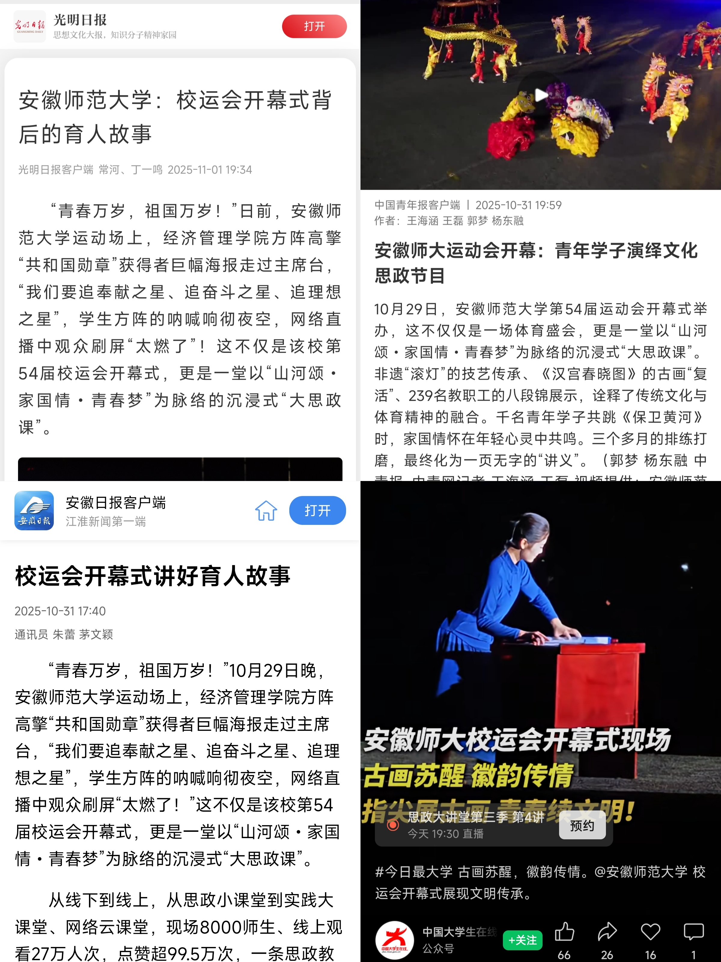 开幕式融合非遗“滚灯”技艺传承、《汉宫春晓图》古画“复活”、239名教职工八段锦展示、千名学子共舞《保卫黄河》等元素,生动诠释了传统文化、体育强国、家国情怀等思政元素与体育精神的深度融合。光明日报、中国青年报、教育部中国大学生在线官方视频号、安徽日报等多家中央、省级主流媒体聚焦开幕式背后的育人故事,深度解读我校通过“典礼育人”实践体系,将思政教育融入校园生活重要节点的创新探索,引发社会广泛关注。
