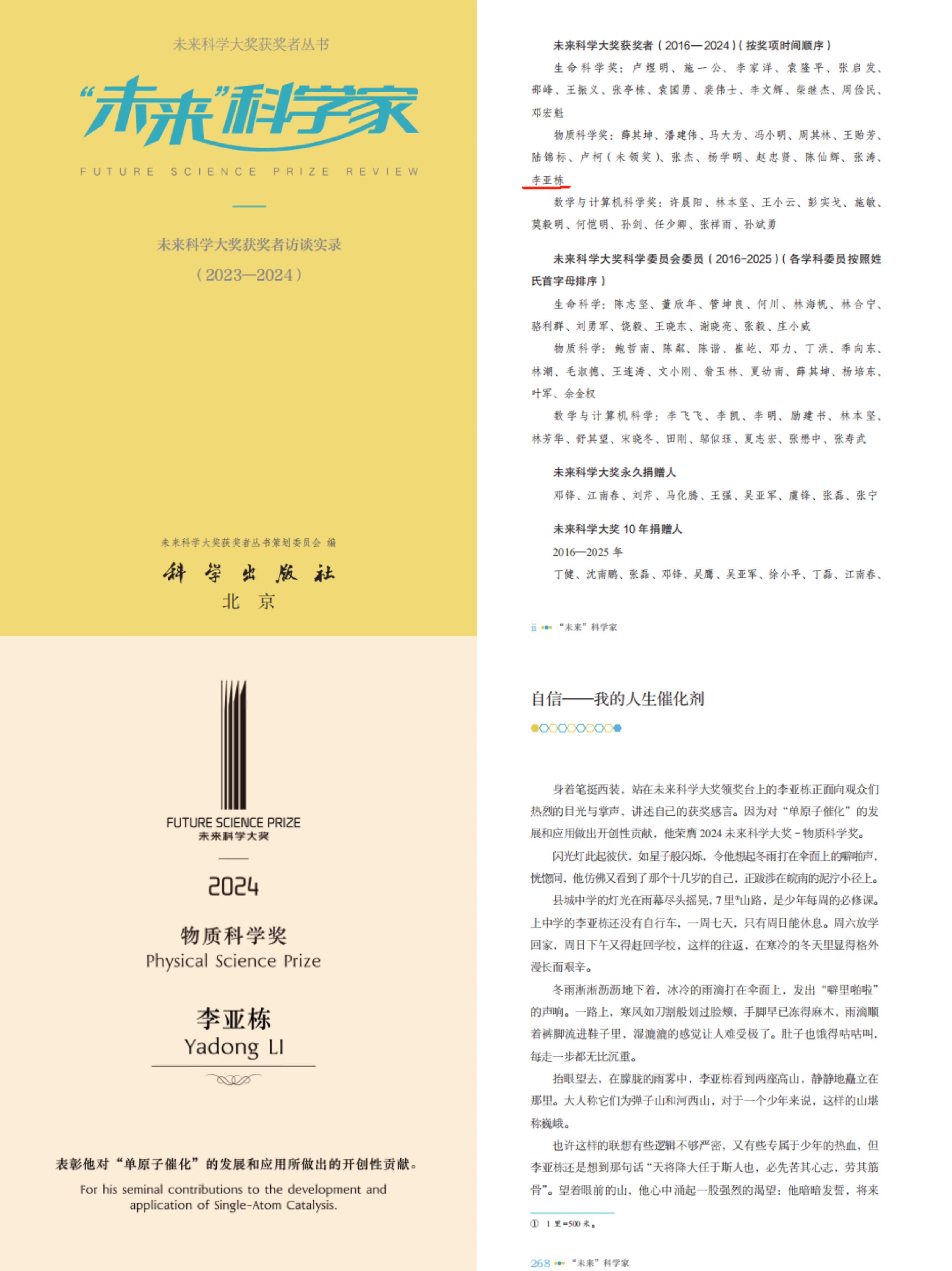 2024年8月16日,2024未来科学大奖获奖者名单公布,我校时任校长、中国科学院院士李亚栋与中国科学院院士、中国科学院大连化学物理研究所研究员张涛共同获得“物质科学奖”。近日,由未来科学大奖获奖者丛书策划委员会编撰的《未来科学家:未来科学大奖获奖者访谈实录(2023—2024)》一书由科学出版社正式出版。