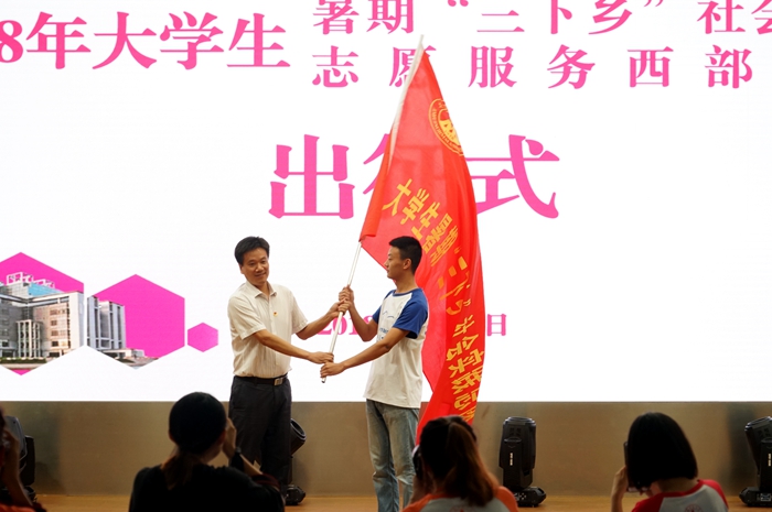 青通社讯(宁嘉惠 骆 晨 李文汇 吴 辉 黄彦锴 陈 骁)青年大学习,奋斗新时代。6月27日下午,学校在花津校区理科大楼报告厅举行2018年大学生暑期“三下乡”社会实践活动暨志愿服务西部计划出征式。校社会实践领导组组长、西部计划领导组组长、党委常委、副校长毕明福出席出征式并讲话。校社会实践领导组成员,各学院分管领导、团委负责人,重点团队指导老师代表,以及全校社会实践重点团队队长、安全员、队员代表,2018年西部计划志愿者参加出征式。