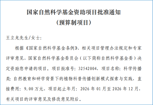 近日,国家自然科学基金委员会公布了生命科学领域2025年度科学传播类专项项目评审结果,我校生命科学学院王立龙研究员申请的“科学传播类:自然教育和研学背景下的植物科普传播创新模式探索与实践”项目成功获批立项。这是我校首次在国家自然科学基金科学传播类专项项目立项中取得突破。