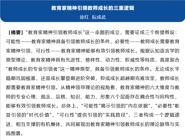 1月27日,我校教育科学学院徐红、阮成武教授在教育学顶刊《教育研究》2026年第1期合作发表题为《教育家精神引领教师成长的三重逻辑》的研究论文,揭示了教育家精神引领教师成长的理论脉络与实践图景。