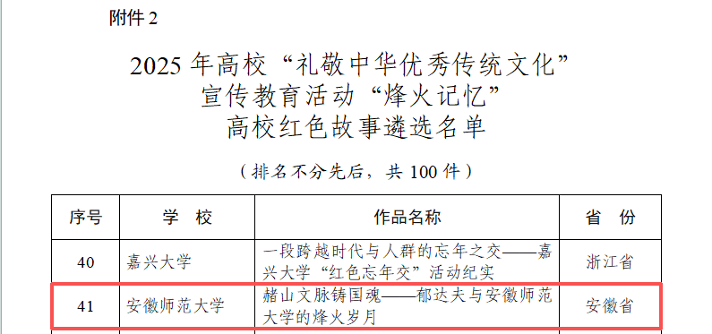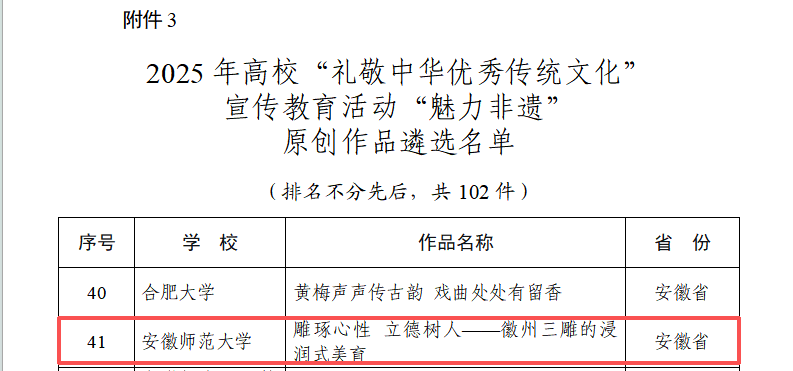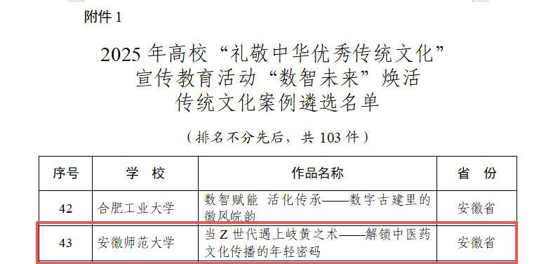 近日,教育部公布了2025年高校“礼敬中华优秀传统文化”宣传教育活动结果,由我校报送的3个项目全部入选,获奖数位列全省高校第一。其中,其中“当Z世代遇上岐黄之术——解锁中医药文化传播的年轻密码”入选“数智未来”焕活传统文化案例;“赭山文脉铸国魂——郁达夫与安徽师范大学的烽火岁月”入选“烽火记忆”高校红色故事;“雕琢心性 立德树人——徽州三雕的浸润式美育”入选“魅力非遗”原创作品。