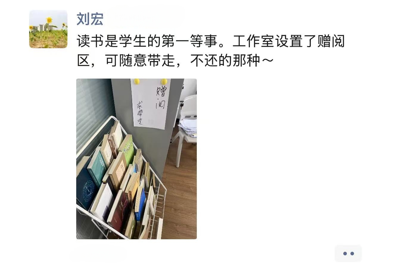 刘宏老师一直习惯于根据学生兴趣赠送书籍,鼓励大家不为应试、只为热爱而阅读。新学期整理工作室时,他特意腾出一个角落,将家中普及读物、专业著作集中摆放,正式打造开放式赠阅区。“‘不还’并非不在意这些书籍,而是希望学生能真正把书读进去、用起来。”在刘宏老师看来,读书不该被功利所捆绑,让书流动起来,才是对知识的最大敬重。
