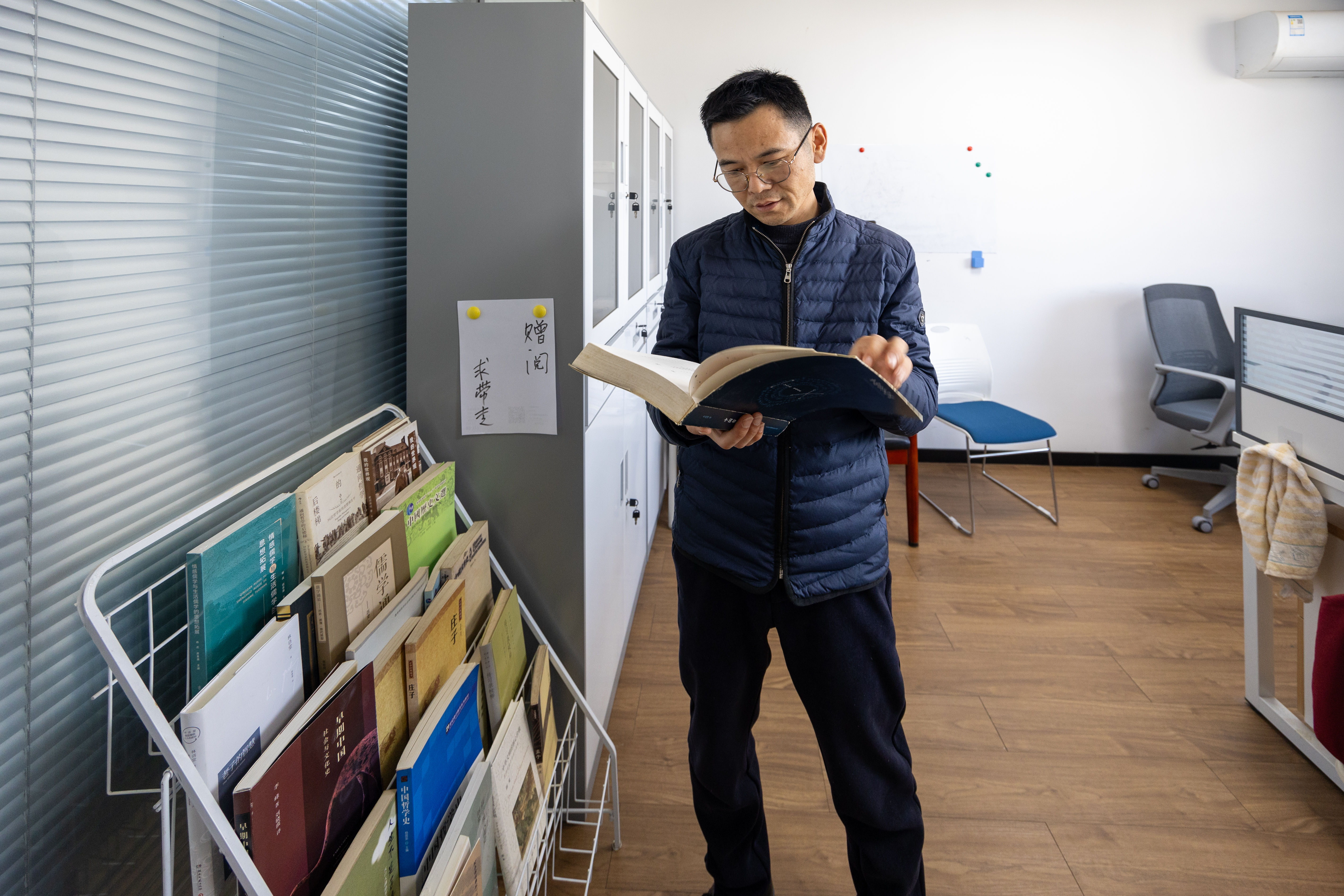 “读书是学生的第一等事。工作室设置了赠阅区,可随意带走,不还的那种~”近日,安徽师范大学马克思主义学院哲学专业刘宏老师的一条朋友圈在校园里悄然刷屏。一张工作室赠书角的照片里,简易书架上整齐码放着《周易》《庄子》等经典著作,旁边贴着一张手写纸条:“赠阅,求带走”。这个没有门禁、无需登记的“开放式书角”,悄悄成为了校园里温暖的“精神补给站”。