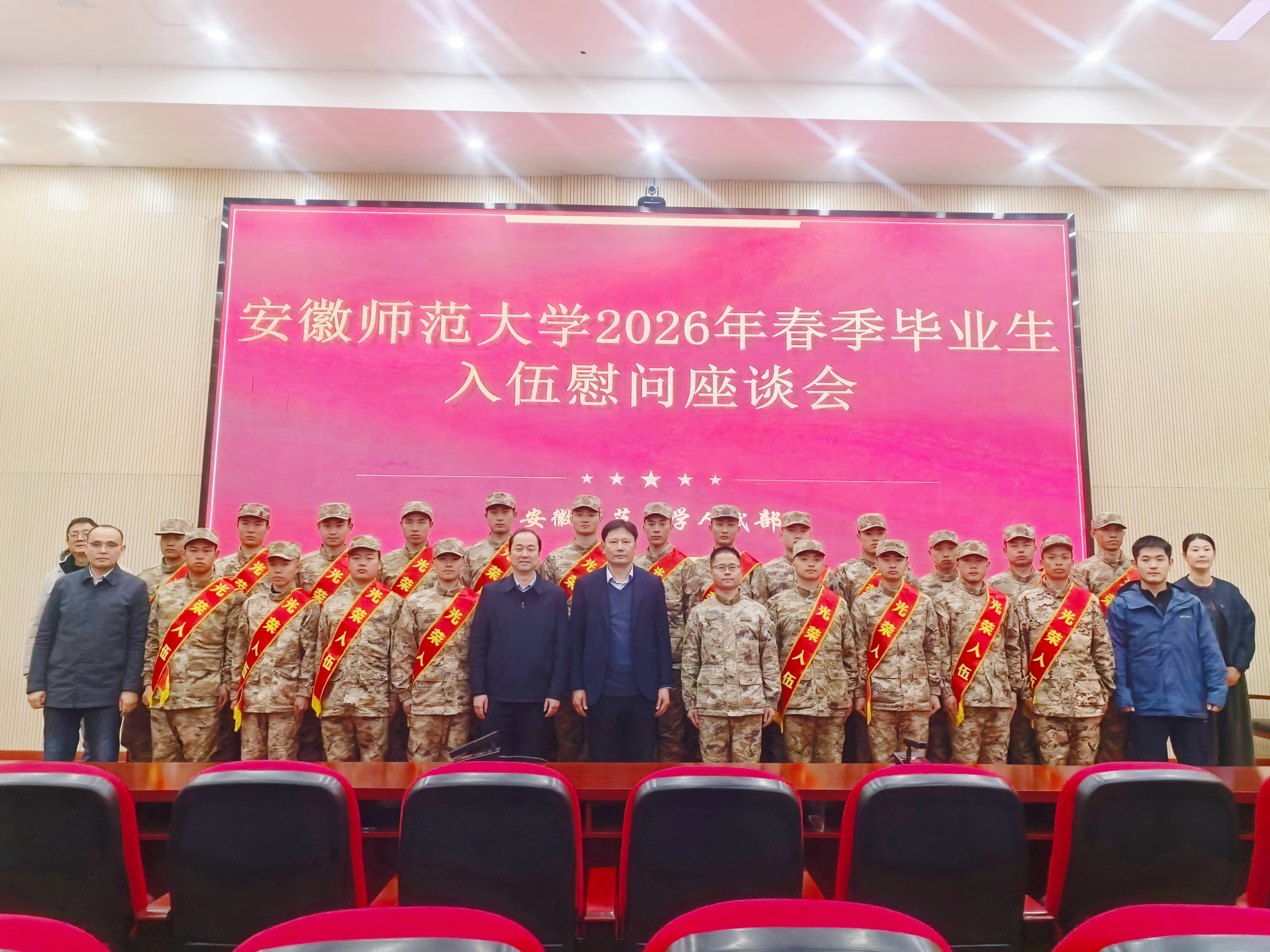 3月15日下午,校党委常委、副校长王刚在镜湖区人武部部长刘忠波、校人武部部长乔静等人陪同下,前往芜湖市役前训练基地,亲切慰问即将奔赴军营的我校2026年春季入伍毕业生,为即将踏上军旅征程的学子们送上母校的殷切关怀与美好祝福。
