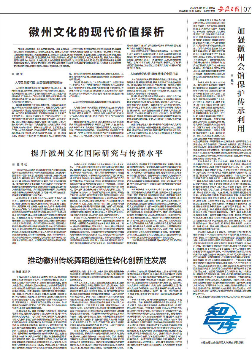 3月17日,《安徽日报》第7版(“思想周刊·理论”智库专版)整版刊发历史学院教师阐释今年全国两会精神的研究成果。四篇文章聚焦徽州文化,分别从文化传承、国际传播、传统舞蹈活化、会馆遗产保护等角度,深入阐释徽州文化在当代社会的现实意义与时代价值。