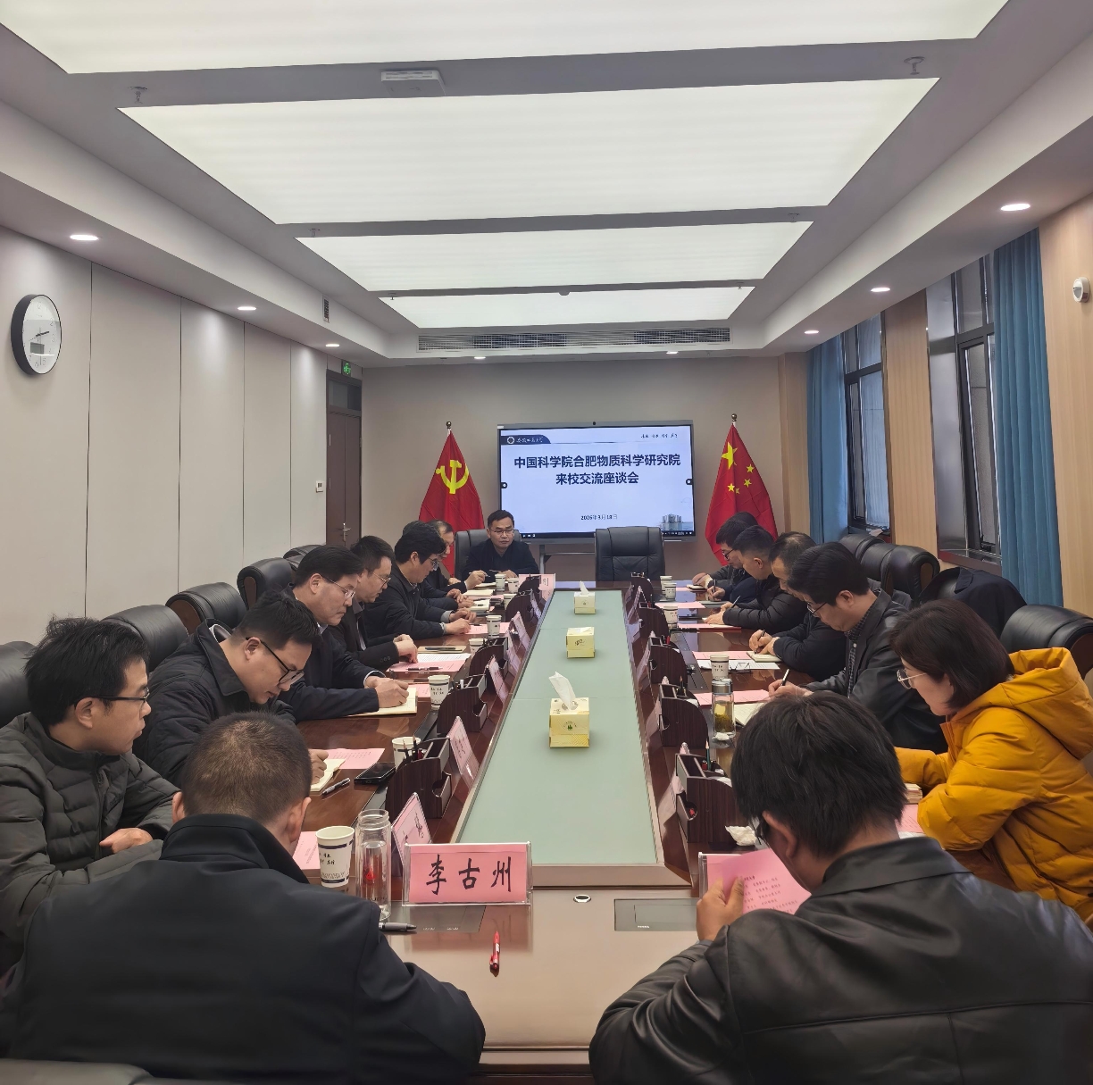 3月18日下午,中国科学院合肥物质科学研究院院长刘建国一行来校调研交流。校党委副书记、校长熊宇杰,校党委常委、副校长高峰出席座谈会,校党委常委、副校长田兴友主持会议。