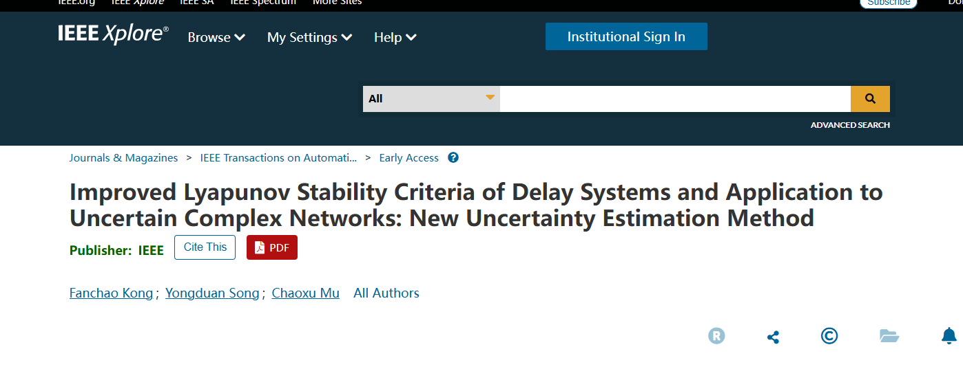 3月27日,我校数学与统计学院孔凡超副教授与重庆大学宋永端教授(中国工程院外籍院士)、天津大学穆朝絮教授合作的学术论文“Improved Lyapunov Stability Criteria of Delay Systems and Application to Uncertain Complex Networks: New Uncertainty Estimation Method”在国际控制与自动化领域两大顶刊之一《IEEE Transactions on Automatic Control》上在线发表,我校为第一完成单位。该项工作得到了国家自然科学基金项目(批准号:62576008、61860206008、62333016)资助。