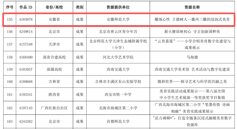 本次案例征集由教育部体育卫生与艺术教育司组织部署,紧扣国家智慧教育平台美育板块建设要求,聚焦数字化美育资源开发、人工智能与虚拟仿真等技术在美育教学中的创新应用,旨在探索数字技术赋能美育育人的有效路径,遴选可复制、可推广的美育实践典型。我校美术学院申报的《雕琢心性 立德树人——徽州三雕的浸润式美育》和新闻与传播学院申报的《基于LoRA模型训练的黄梅戏非遗活化路径:动画角色设计课程开发与“双创”实践》两个案例,分别从数字化美育资源体系构建、智能化美育教学模式创新两个维度,展现了学校以数智技术创新美育路径、提升育人质量的实践探索,为高校美育数字化转型提供了鲜活样本,也体现了教育部对我校美育工作的高度认可。
