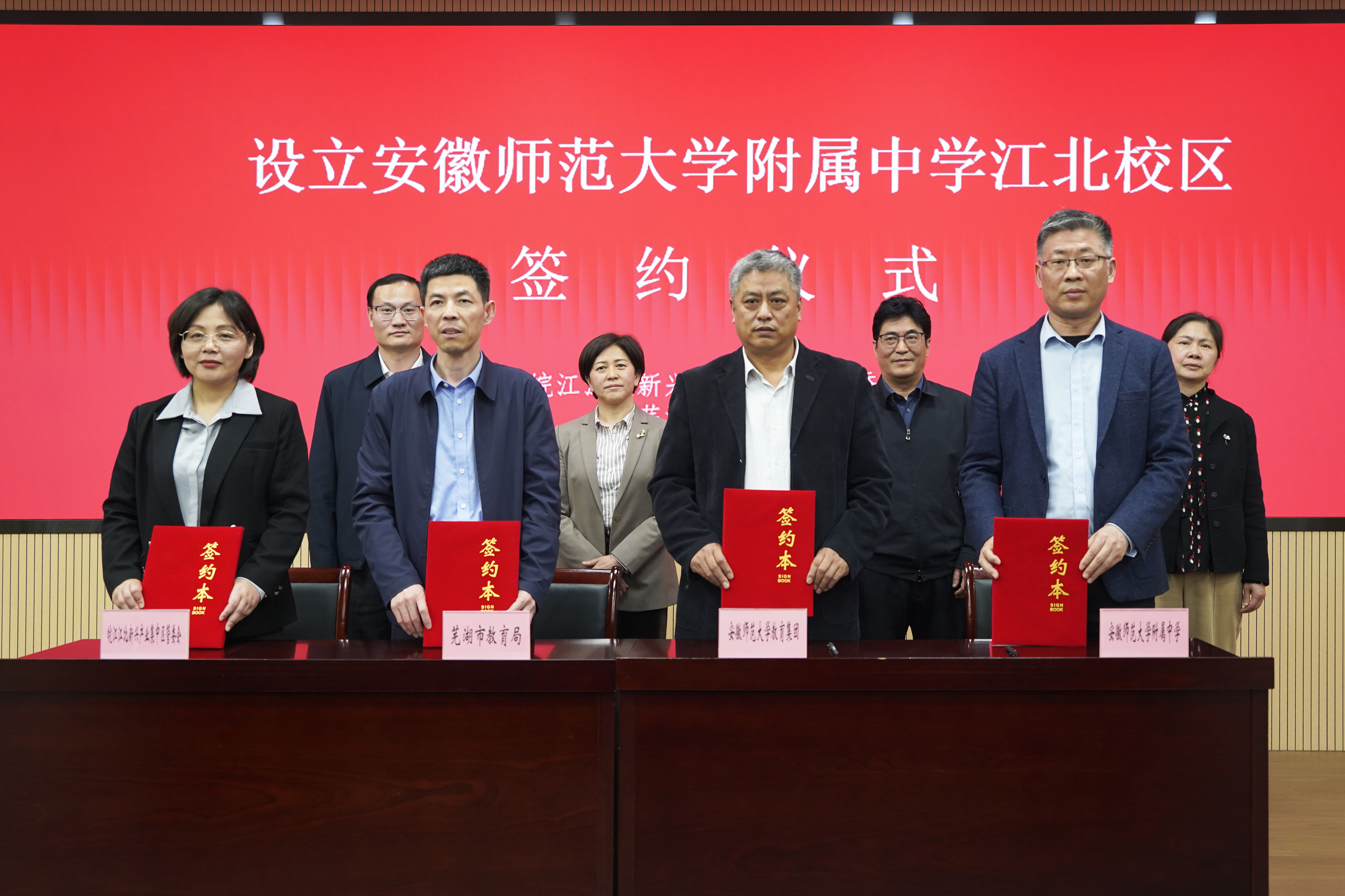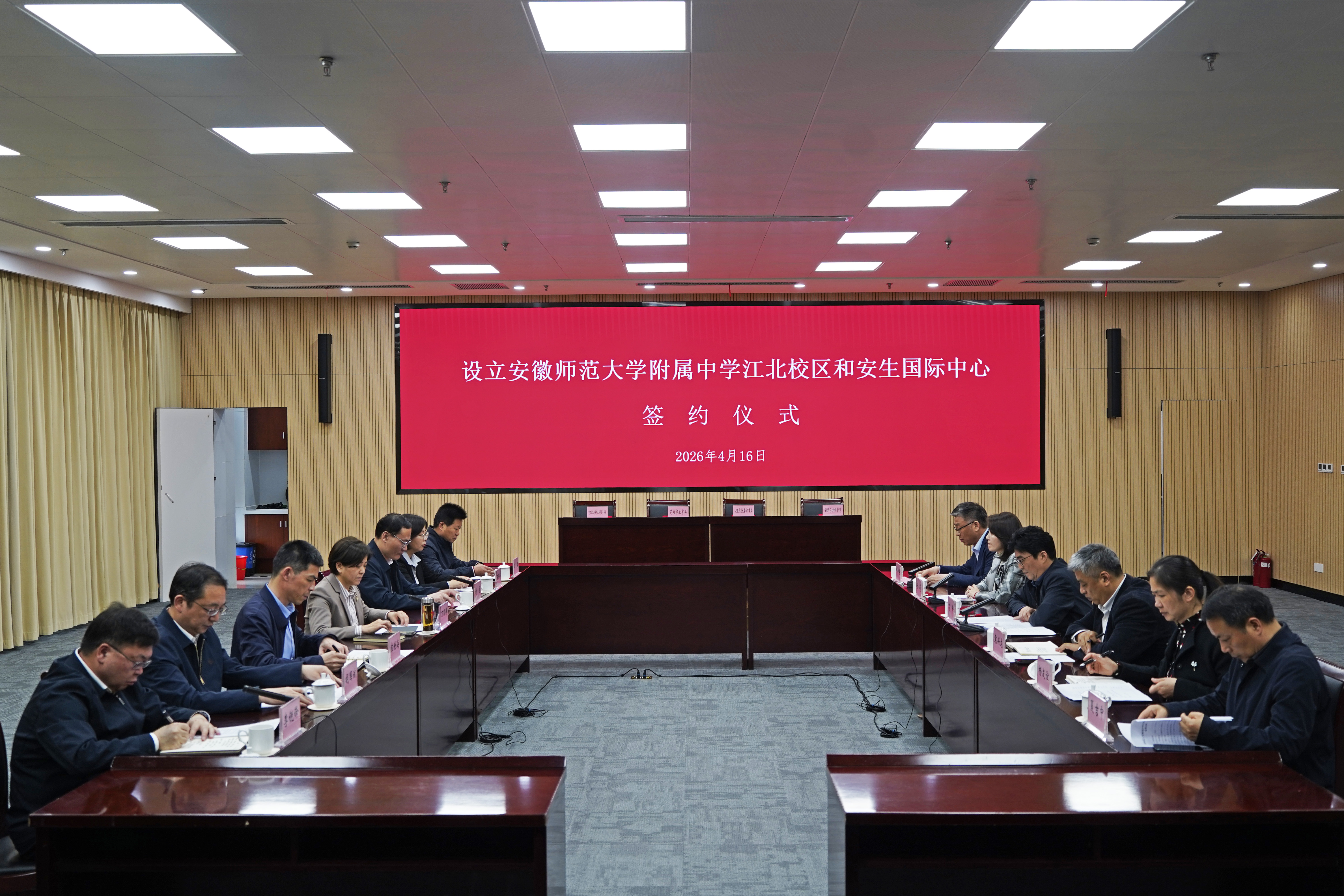 4月16日下午,安徽师范大学附属中学江北校区签约仪式在芜湖市政务中心举行。芜湖市教育局、皖江江北新兴产业集中区管委会、安徽师范大学教育集团与安徽师范大学附属中学共同签署江北校区合作协议,附属中学与安生教育集团完成“附中・安生国际中心”合作签约,这标志着附属中学江北校区建设与办学合作迈入实质落地阶段。