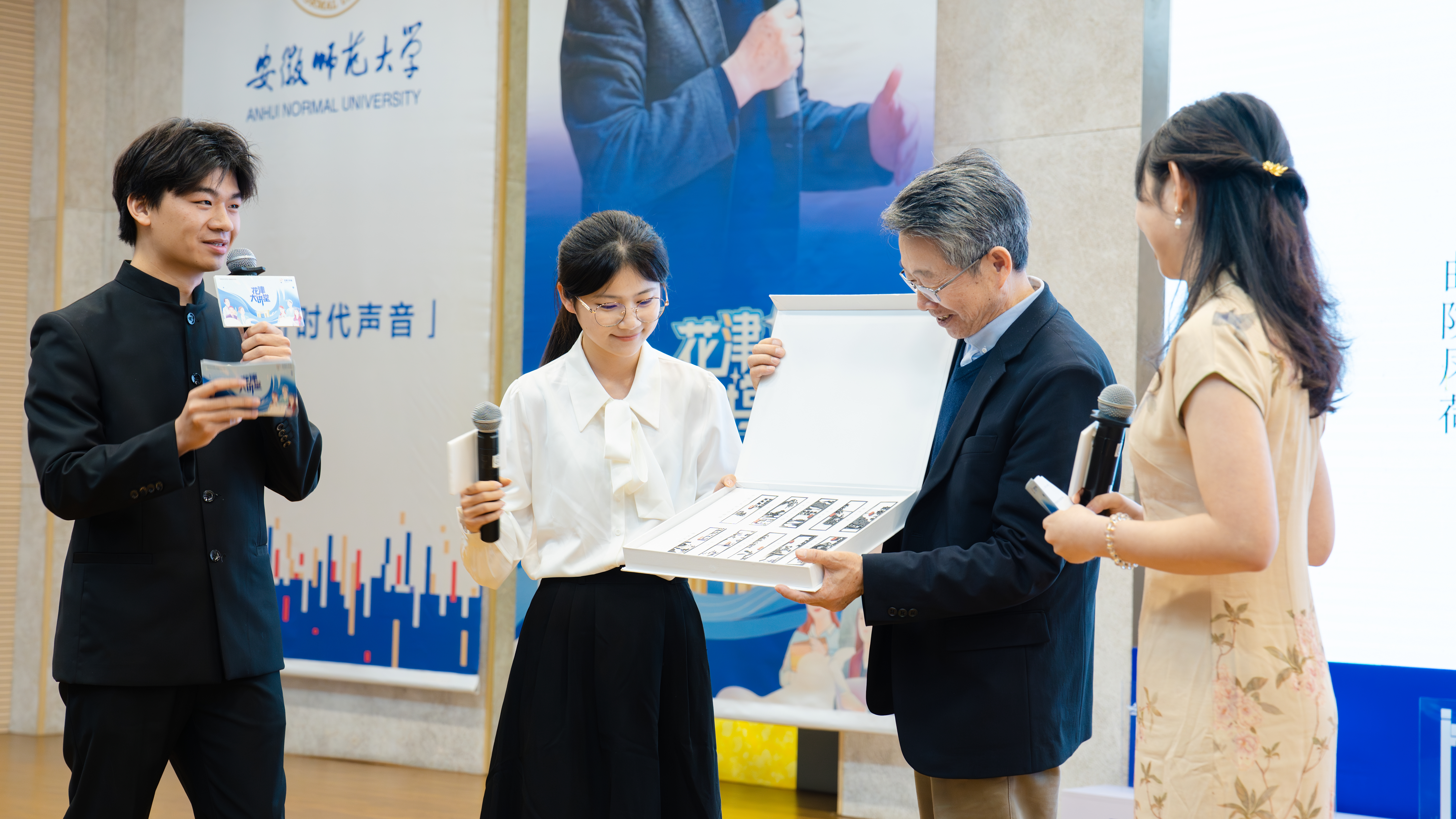 互动环节中,朱良志教授耐心倾听线上留言,解答现场学生提问,交流氛围热烈。他将亲笔签名的《中国美学十五讲》《中国美学要义》等作品赠送给同学们,并表达了对青年学子的美好希冀。我校师生取材朱良志教授深耕学术三十载的10部学术著作封面并精心设计,用芜湖非遗铁画技艺打造专属书签赠予朱良志先生,表达敬意。