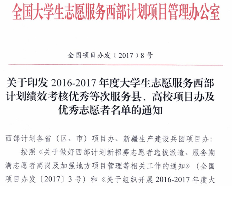 青通社讯(文/宁嘉惠 张园园)近日,全国大学生志愿服务西部计划项目管理办公室下发了《关于印发2016-2017年度大学生志愿服务西部计划绩效考核优秀等次服务县、高校项目办及优秀志愿者名单的通知》(全国项目办发[2017]8号),我校西部计划项目办因工作扎实、成绩突出,第六次获评全国优秀项目办;王晨露6名同学踏实工作,甘于奉献,获评2016-2017年度大学生优秀西部计划志愿者,这是历年来志愿者获优最多的一次