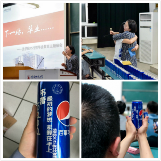 本网讯(法学院 瞿津津)“没想到在毕业前居然收到了四年前写给自己的信,这感觉真奇妙”,“没想到毕业前辅导员给我们每人送上了一瓶百事可乐,上面有校徽,还有老师写的独一无二的一句话,真是太幸福了”,这样没想到还有许多……学生口中的这些“没想到”来自于法学院2015级行政管理专业毕业教育主题班会,这也是法学院毕业文明离校教育的组成部分。