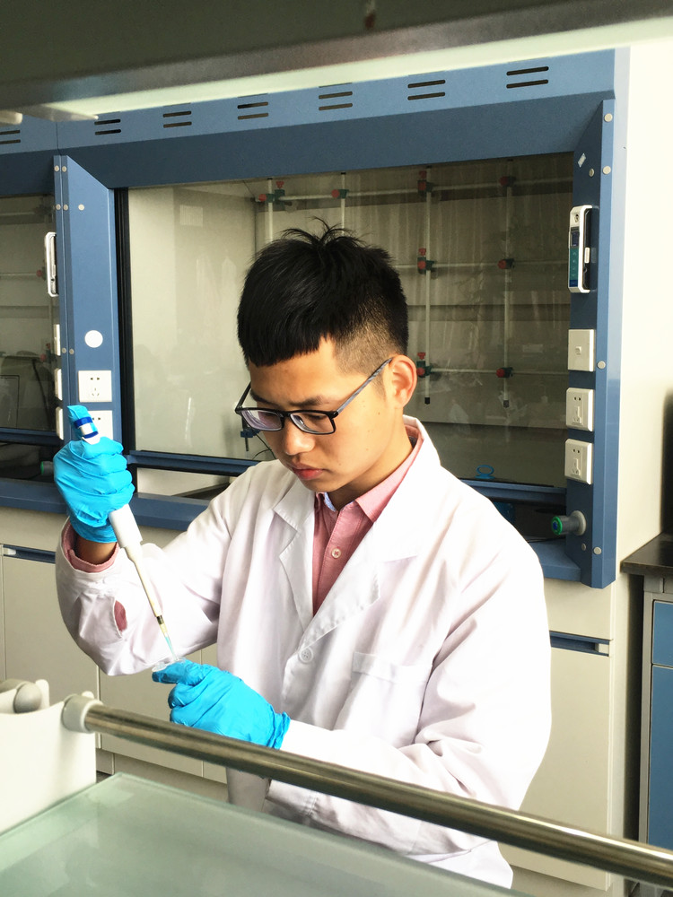 从一开始接触化学的时候,他深深的被这个从实验中得到真理的科学而吸引,为他着迷。从高中时期的参加各种化学竞赛到大学选专业毫不犹豫的选择了化学。大一刚入学一次偶然的机会,他听了一场蒯龙同学做的报告,本科生就可以发表SCI科研论文,这为他的大学生涯提供了新的方向。就这样他成为班级第一个联系导师进入实验室的同学,埋头专研、潜心研究,一晃三年,坚持到如今。