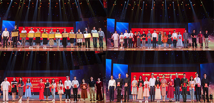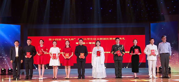 颁奖典礼上,颁奖嘉宾们分别为第十四届“讯飞杯”全省大学生诗文朗诵比赛中,荣获专业组一等奖的安徽师范大学作品《雷锋之歌》、荣获非专业组一等奖的陆军炮兵防空兵学院作品《英雄归来》、阜阳幼儿师范高等专科学校作品《赤壁赋》、安徽师范大学作品《琵琶行》等获奖人员以及安徽大学、安徽师范大学、安徽工业大学等12所荣获“优秀组织奖”的高校颁发荣誉证书。