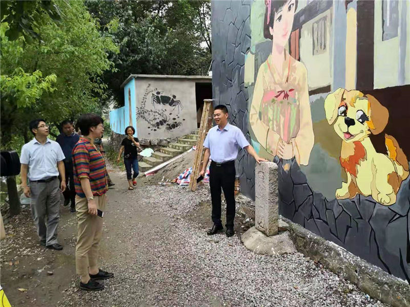 彭凤莲一行到达目的后,随即来到朱桥乡慈济中心小学看望美术学院“美育聚梦课堂”艺术支教团队的师生。教室里正进行着“我和我的祖国”系列创意儿童画课程,同学们创作完毕后,合唱歌曲《我和我的祖国》,并将绘画的作品进行展示,彭凤莲等人与孩子们进行了亲切交流互动。随后,彭凤莲一行在朱桥乡党委书记严家福的陪同下来到美术学院“博爱江淮环保行”助力美丽乡村建设的实践地何村和浑水村,看望正在开展墙绘绘制的学生。现场一幅幅彩色的画卷映入眼帘,3D互动式墙绘、皖南花鼓戏、板龙灯等结合地方特色的墙绘给现场的领导老师留下了深刻的印象。彭凤莲对同学们绘制的墙绘表示肯定,叮嘱在脚手架上绘画的同学们务必注意安全。