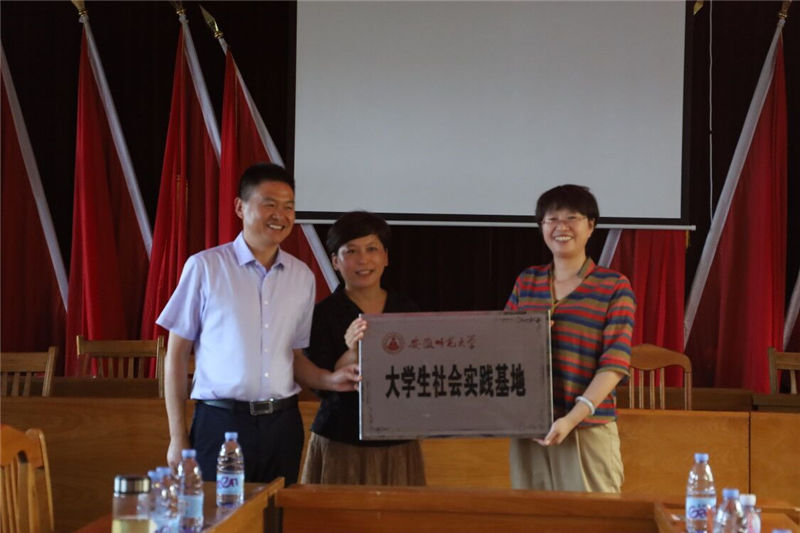 慰问结束,彭凤莲一行在朱桥乡政府的会议室举行社会实践师生座谈会暨社会实践基地挂牌仪式。彭凤莲对美术学院赴宣城朱桥开展暑期社会实践团队取得的成果表示充分肯定,对宣州区领导和村民们对安徽师范大学社会实践活动的支持表示感谢。彭凤莲希望同学们以此次社会实践为契机,强化社会实践能力,学会融入社会,努力创作出更多的文艺作品,以优秀的作品为美丽乡村建设增添光彩。座谈会上,宣州区委常委、宣传部长王建玲对美术学院助力宣州区乡村振兴发展表示感谢,表达进一步合作的愿望。美术学院党委书记王继民介绍了美术学院近年来的发展情况,对宣州区支持美术学院开展社会实践活动表示感谢,并表示深化校地合作的期待。座谈结束,彭凤莲和王建玲共同为安徽师范大学大学生暑期社会实践基地揭牌。