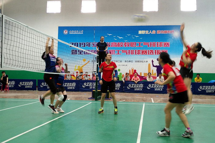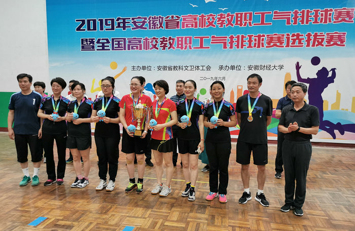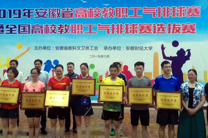 本网讯(校工会) 6月15至16日,2019年安徽省高校教职工气排球赛暨全国高校教职工气排球选拔赛在安徽财经大学西校区体育馆举行。本次比赛由皖中、皖南、皖北三个片区选拔出的来自全省高校系统的12支代表队参赛。我校组队参加了女子组比赛,获得季军,校工会荣获优秀组织奖。