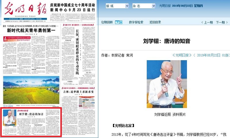 本网讯(党委宣传部 张鑫)8月22日,《光明日报》头版“光明访名家”栏目较大篇幅刊发了对我校文学院唐诗专家、著名教授刘学锴先生的专访。报道中指出:“1975年至2004年,刘学锴集中研究唐代诗人李商隐,先后出版10多部相关著作,发表30多篇相关论文。刘学锴因此被誉为‘国内研究李商隐第一人’”“刘学锴用自己‘繁华落后见真淳’的学术著作,‘以一人之力,成一家之言’,从而让自己成为真正的‘唐诗知音’”。