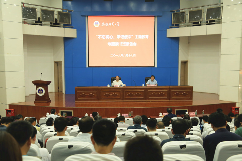 17日下午,学校在敬文图书馆报告厅组织召开“不忘初心、牢记使命”主题教育专题读书班报告会,在校校领导,全校处级干部,机关、各学院科室负责人,全校辅导员,马克思主义学院思政课教师参加了报告会。校党委书记顾家山主持报告会。