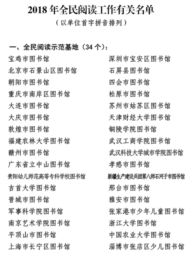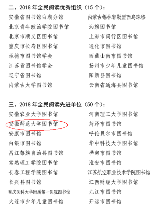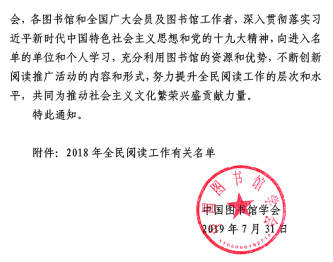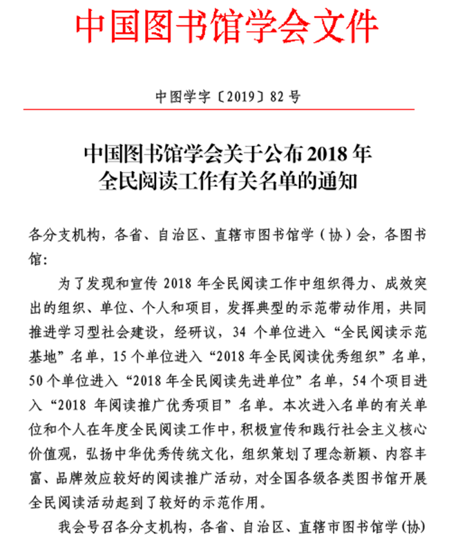 本网讯(图书馆)近日,中国图书馆学会公布“2018年全民阅读先进单位”名单,我校图书馆荣获“2018年全民阅读先进单位”荣誉称号。