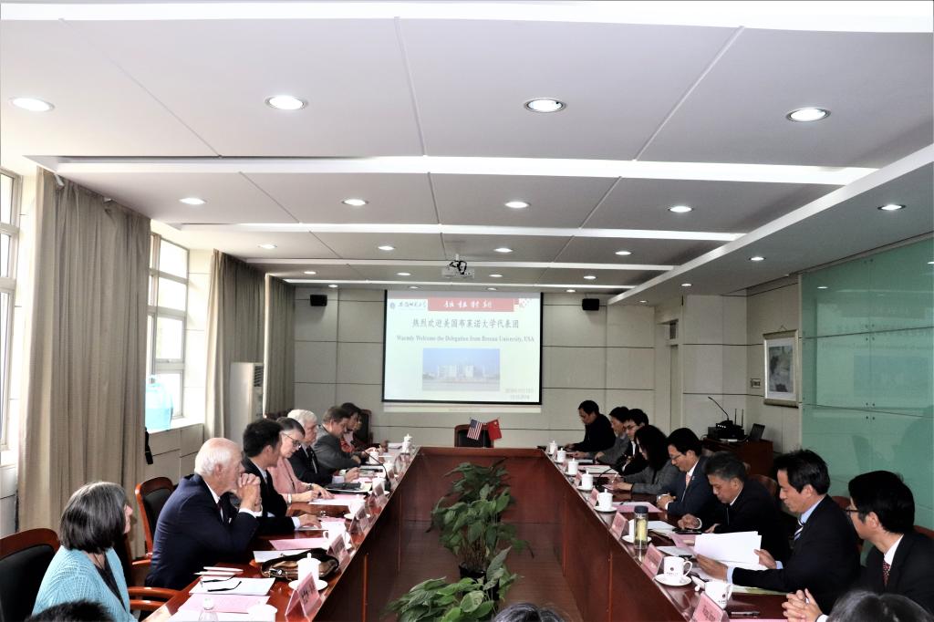 本网讯(国际交流合作处 文/王曌婧、夏彩虹 图/张超)11月13日,美国布莱诺大学校长安妮·思克莱德、名誉校长爱德华·施莱德、董事会主席彼得·米勒、教务长兼副校长詹姆斯·艾克以及基金会联络人叶晴等访问我校。校长张庆亮、副校长陆林亲切会见代表团成员,国际交流合作处处长黄圣炯、教务处处长周端明、美术学院党委书记王继民、外国语学院院长张德让、教育科学学院副院长辛治洋、教育基金会项目管理部长郑金泽以及布莱诺大学在校外教和两校合作项目负责人。