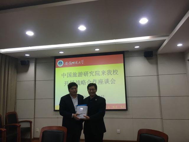 戴斌对我校的办学特色和旅游科学研究取得的成绩给予了充分的肯定,认为安徽师范大学是全国旅游科学研究的学术高地,为安徽乃至全国旅游发展做出了重要的贡献。他希望以此次交流为契机加强战略合作,借力我校研究团队,在中国旅游研究分院(基地)建设、旅游科学研究、学术共同体建设、旅游研究国际化、院校共建学科、联合开展社会服务、联合开展学术活动,以及联合开展国家对外交流合作与人才培养,服务国家“一带一路”倡议等方面进行全方位合作。