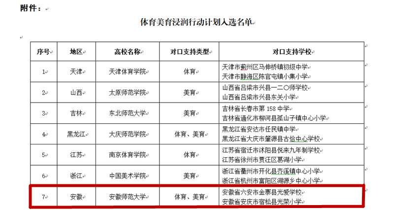 本网讯(教务处 汪文文)近日,教育部公布了首批体育美育浸润行动计划入选名单。经高校自主申报、省级教育行政部门遴选推荐、教育部组织专家审核遴选、公示等环节,全国共20所高校入选。我校是安徽省唯一入选高校,同时也是全国10所美育、体育同时入选高校和10所师范大学之一。