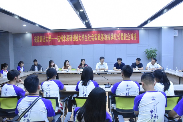 在揭牌仪式上,任琳琳代表杭州华研创科技发展有限公司对安徽师大领导老师一行表示热烈的欢迎,系统介绍了园区基本情况、功能定位、发展现状。杭州高品自动化设备有限公司、杭州东田科技有限公司、杭州碟滤膜技术有限公司、杭州森航科技有限公司等四家高科技企业负责人围绕用人需求和大学生职业规划作了现场交流。陈莉对杭州市大学生就业创业政策作了全面解读。