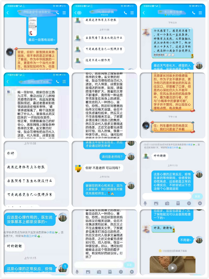 学校多途径提高抗“疫”工作的时效性,通过易班平台“携手抗疫”专栏、微信公众号等多媒体平台推送“给AHNUers的心理调适指南”等多篇文章,实时推送疫情应对的生理和心理防护技能,向全校师生公布全国各地的心理援助热线。不断加强学校心理咨询师心理疏导和心理支持知识的培养和积累,积极利用线上微信群,不定期转发专业的心理支持知识和具体措施,中心专职人员开展线上办公,不定期探讨心理支持有关工作,做好校内同侪心理支持。