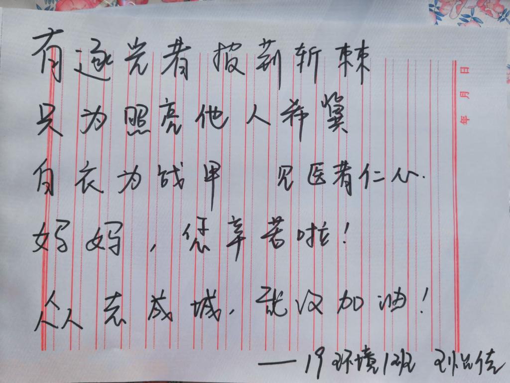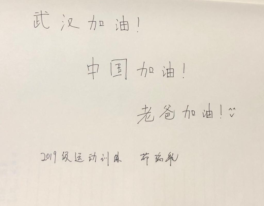 疫情期间,陈欣玥(19体育学院)妈妈作为医生,她的工作比平时更危险更忙,医院开设预检分诊,接触的都是发热病人。陈欣玥说:“妈妈值班、开会、培训,每天都要很晚回来。”陈欣玥的母亲前几天写下了请战书,她说:“国难当头,每个人都有责任做出自己的贡献。希望妈妈一定要平安,希望奋斗在一线的各行工作者都要平安。我们都在等他们平安回家。”