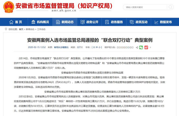 本网讯(生科院)近日,安徽师范大学野生动植物种及其产品鉴定中心受安徽省宿州市泗县市场监管局委托办理了一起违规交易野生动物制品案,处置及时得当,切实维护了市场经营秩序,有力保护了人民生命安全和身体健康。日前,该案件入选了国家市场监督管理总局通报的“联合双打行动”典型案例。