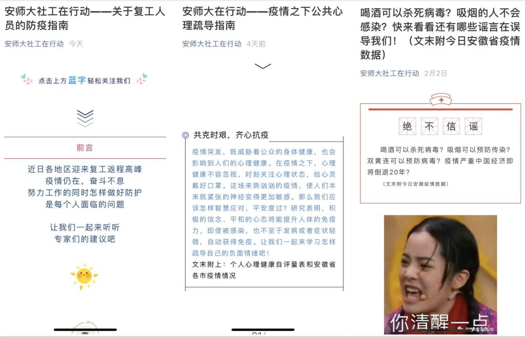 宣传防疫知识,传达疫情信息。社工专业的师生积极组建“抗击疫情”专项微信公众号——安师大社工在行动,由研究生搭配本科生,负责公众号的运营。公众号设置了抗毒小贴士、辟谣专区、专家发声等板块,每日推送老年人、儿童等弱势群体的防疫指引、疫情下的心理疏导指南、复工指南等,向基层普及防疫知识。师生们还利用海星社工社会工作服务社的留守儿童正面成长项目微信群,积极发布防治新冠肺炎的知识,向留守儿童家长们传达最新疫情信息,灵活开展专业实践,用行动践行专业知识。