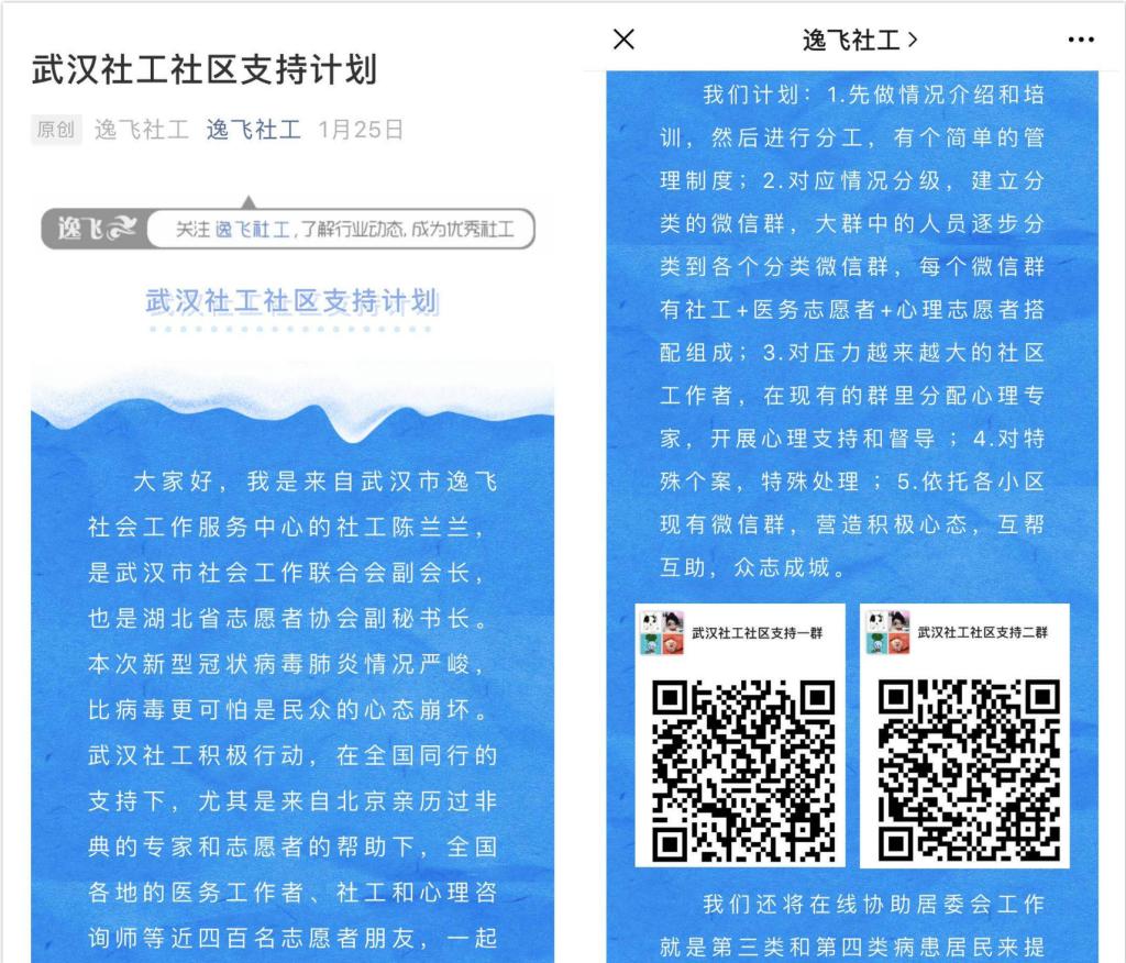 发挥专业优势,助力一线服务。疫情就是集结号。社工专业学生积极报名参与一线抗“疫”服务。2016级社会工作专业学生李洋、符茂林参与了“武汉社区支持计划”,该计划由武汉市逸飞社会工作服务中心组织,链接全国各地社工、心理咨询师、志愿者等资源,通过“医务+社工+心理”线上协作模式,为“战时状态”的武汉社区提供全方位立体式的线上服务。两名社工专业学生在该计划中担任联络员,每天及时上线评估居家隔离者的需求,做好服务引导,协助社工、医生、心理咨询师、患者及其家属之间实现线上有效沟通。每天几千条甚至上万条的咨询、回复与记录工作,虽然繁杂,但他们用行动诠释了社会工作者的专业价值观,赢得了主办社工服务中心负责人和社区居民的肯定与赞扬。