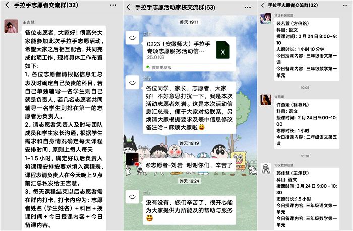 压实责任,规范构建运行机制。目前,校团委牵头建立志愿者交流群和志愿活动家校交流群,28名志愿者经过前期与学生的沟通和交流,已有序与帮扶家庭对接,按“一家一策”要求,制定出“一对一”或“多对一”的线上辅导课程表,志愿者每天通过群内打卡的方式反馈每日的辅导内容,团队安排专人负责跟踪、统计、评估志愿者工作,力求实现志愿服务的规范化、实效化。