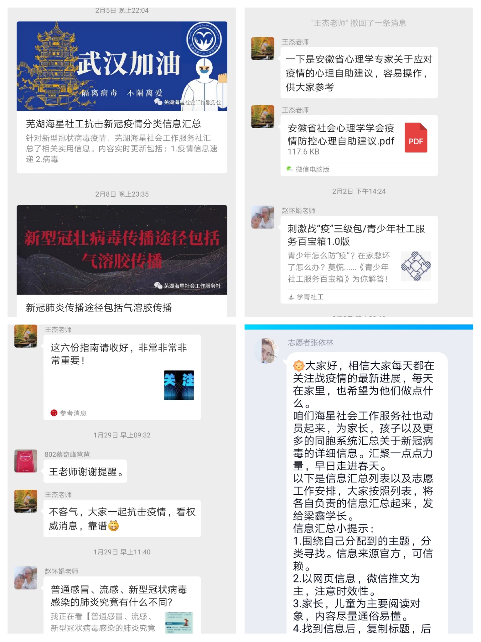 统筹兼顾,用心呵护。芜湖海星社会工作服务社是在历社学院和市民政局的支持下,于2009年创办的芜湖市首家提供专业社会工作服务的民间非营利机构。创办以来,机构一直是社会工作专业学生锻炼专业技能、服务社会大众的重要实践平台。疫情期间,服务社的老师们立足最新数据,结合自身条件,组织志愿者们成为大家身边的“防疫抗疫信息速递员”。据服务社法人代表王杰老师回忆,1月20日得知新冠肺炎形势严峻时,就立即想到服务社应该有所作为。5位理事老师商讨后决定,服务社要组织志愿者结合正在执行的芜湖市第五届公益创投项目“乐优力”流动儿童正面成长服务项目开展服务。服务社通过微信公众号、官方微博传递信息,又在石墨文档上整理汇总更加全面、权威和动态更新的信息。此外,服务社还通过微信群和电话与流动儿童及家长、领导老师始终保持密切联系,每天更新疫情动态,提供有关防疫指导,以询问家长和老师的方式,细心记录、用心关注每个孩子春节期间的动向,真正做到对流动儿童负责,对机构专业使命负责。