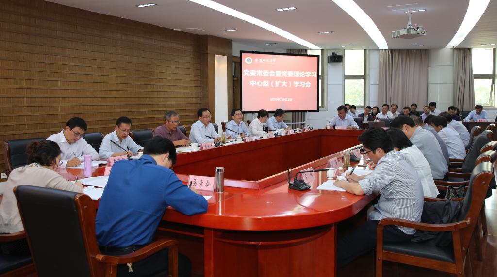 本网讯(宣传部 王俊荣/文 王哲谦/图)10月12日,学校召开党委常委会暨党委理论学习中心组(扩大)学习会,传达学习习近平总书记在教育文化卫生体育领域专家代表座谈会上的讲话精神、省委十届十一次全会和李锦斌书记讲话精神,研究部署学校贯彻落实工作。校领导胡朝荣、张庆亮、蒋家平、彭凤莲,校党委委员、各单位主要负责人、各学院书记、院长参加学习会。校党委书记胡朝荣主持会议并讲话。