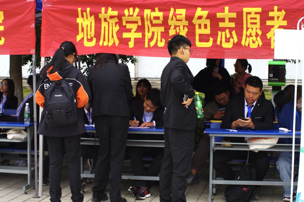 操场外的蓝色帐篷里,坐着一群可爱的同学们,他们是来自地理与旅游学院联合体育学院组织的绿色志愿者团队。今年的志愿者团队不仅负责场外的打印海报、运送物资,还负责场内的秩序维持、气氛烘托,比如打鼓挥旗、接力加油等。